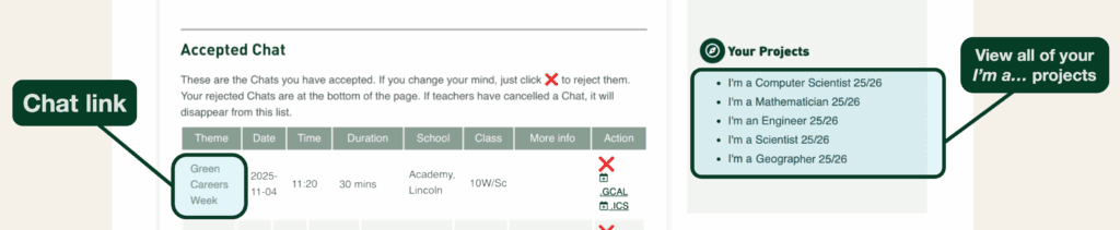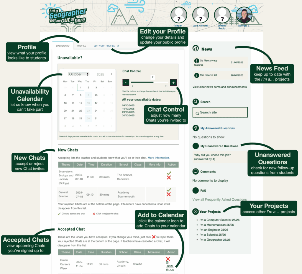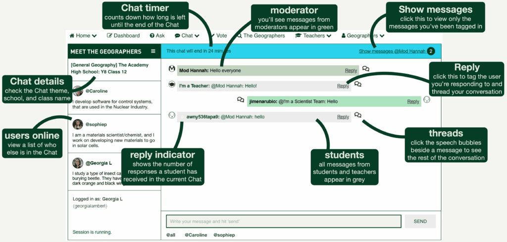 Geography-themed Chats take place on I’m a Geographer, science on Iâm a Scientist, engineering on Iâm an Engineer, maths on Iâm a Mathematician, and computing on Iâm a Computer Scientist. Clicking on the Chat link youâre joining from your Dashboard will make sure youâre always in the right place:
