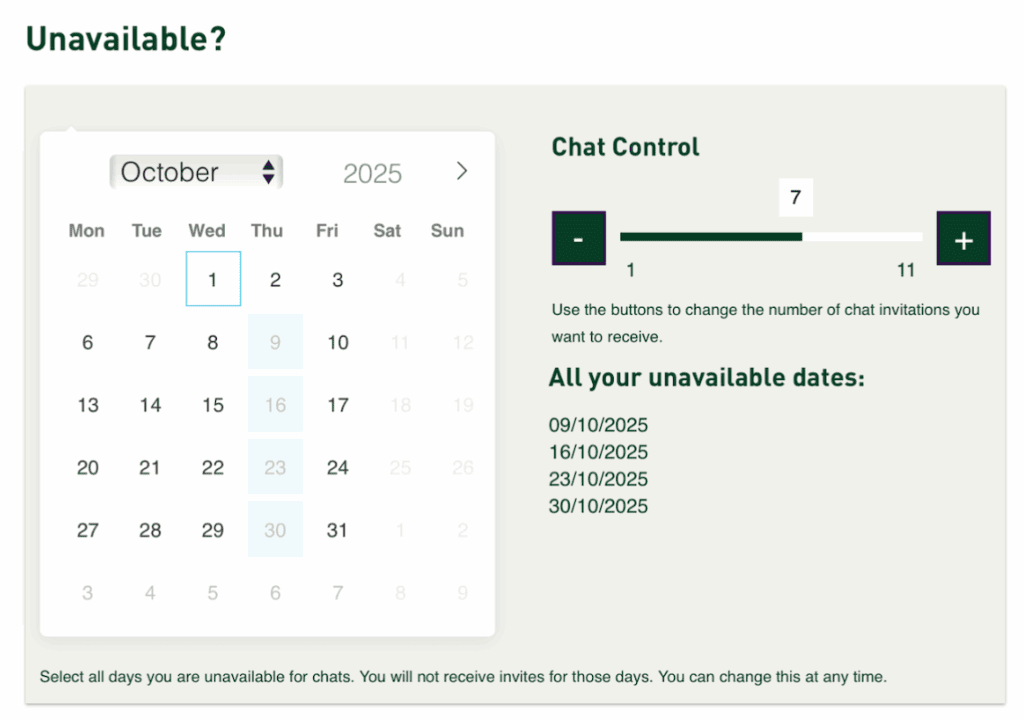 Use the Unavailability Calendar to let us know which days you are unavailable to attend Chats. This allows us to send you more invites on days when you are available.