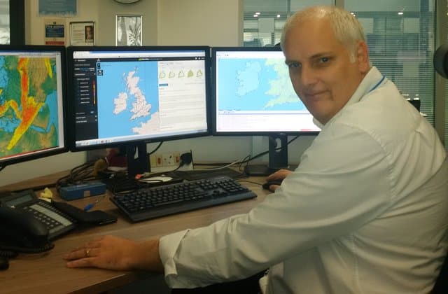 My main job is working in the Flood Forecasting Centre, a joint partnership between the Environment Agency and the Met Office. This is based in the Met Office’s 24/7 operations centre in Exeter. Our job is to tell people where the flood risk is likely to be over the next few days so they can prepare to respond. We forecast for all natural forms of flooding – river, surface water, tidal/coastal and groundwater for England and Wales.