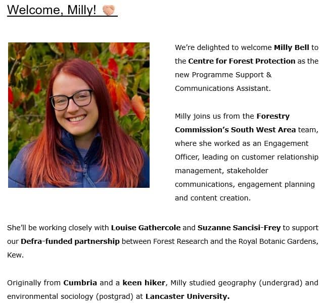 - Managing the day to day running of the CFP website – coordinating with researchers and scientists across Forest Research, Royal Botanic Gardens, Kew, Defra, and collaborators to develop and publish regular blogs, news, research project updates, and training opportunities.